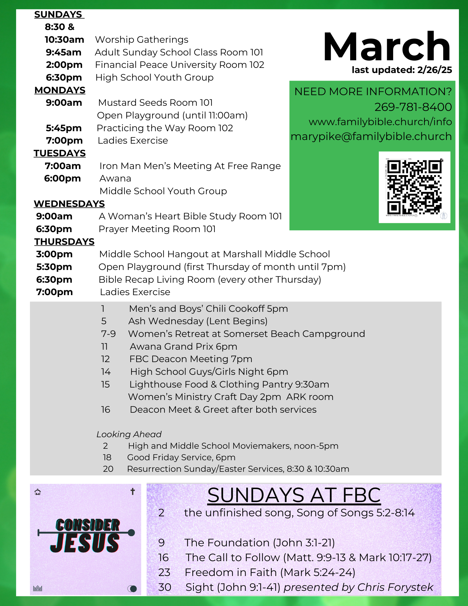 In the event of bad weather forcing the cancellation or change of planned services and events, please find pertinent information on FBC website (look for pop-up banner), FBC Facebook page, email, and WWMT (for Sunday services). Thanks for your patience!