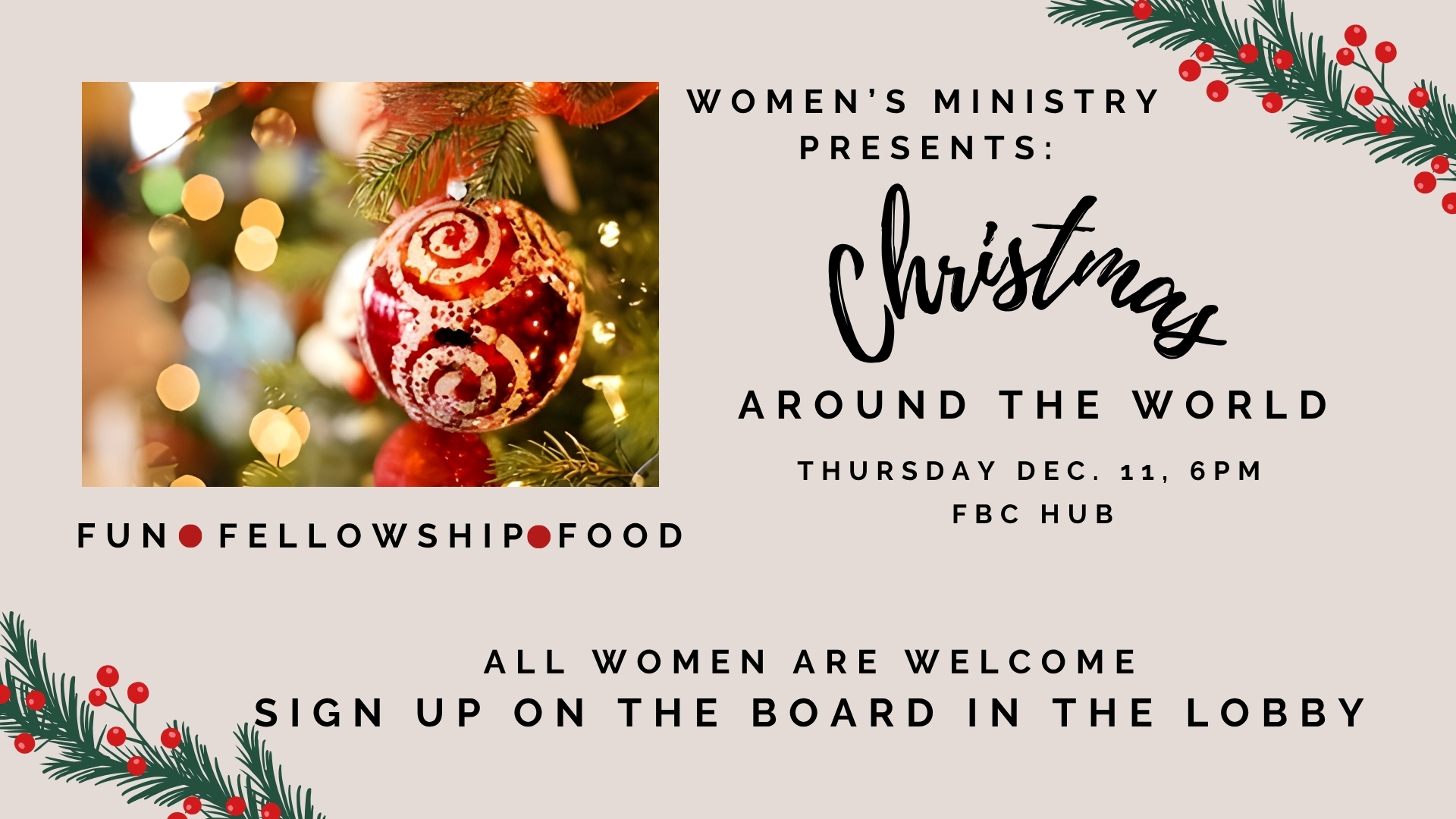You are invited to the Women’s Ministry Christmas Gathering for an evening of fun, food, and fellowship! Please bring an appetizer to share. Soup and desserts will be provided!
