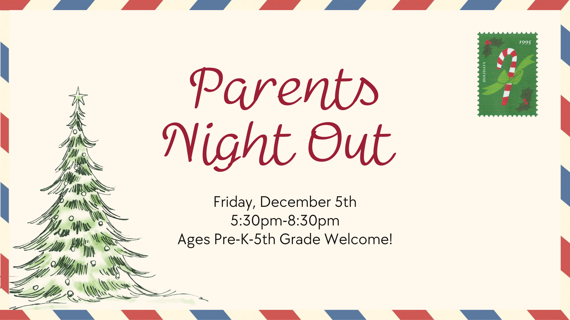 On Friday, December 5th from 5:30-8:30pm, the FBC High School Students will be hosting a Parents' Night Out! Drop off your Pre-K-5th grade kids for a Christmas pajama night and enjoy a night out!
